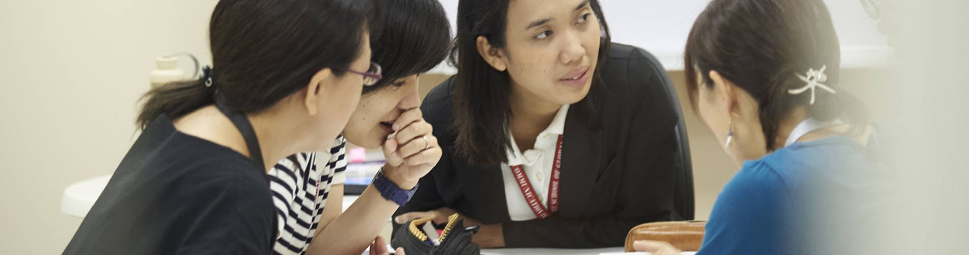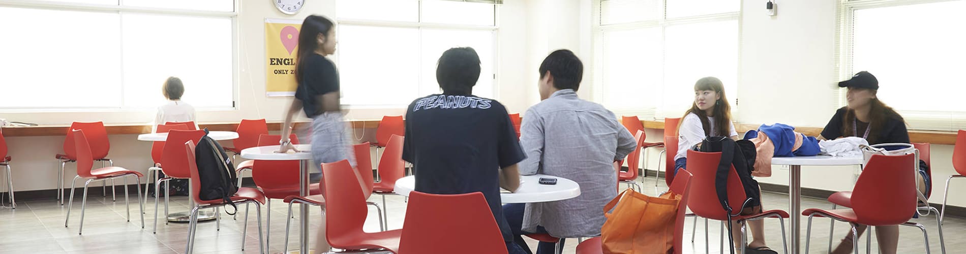 レッスンの合間の休憩時間などに利用できるカフェスペースを用意しています。ここではグループレッスンの仲間と一緒に、夢中で話し込んでいる光景がよく見られるほか、講師と一緒にクリフエッジのプレゼンテーションの練習をしている人の姿も。