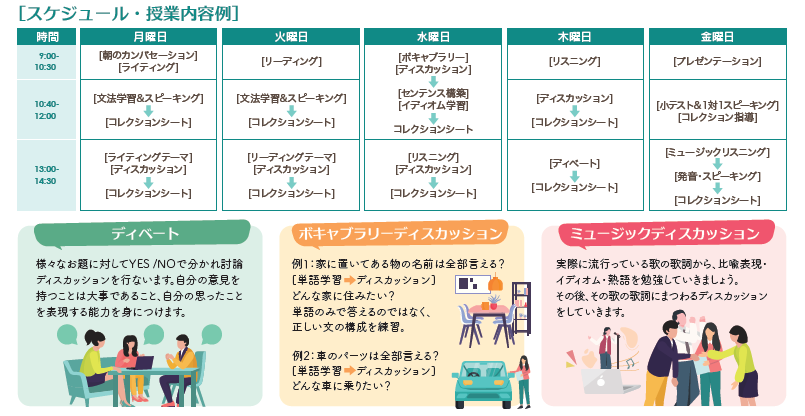 午前・午後共に、スピーキングを中心としたレッスン。学校独自のメソッド&オリジナル教材を用いて、生徒全員のスピーキングを引き出します。会話した内容を、一人ひとりの「コレクションシート」にて先生と一緒に見直していくことで、スピーキング力を着実に上げていきます。デベートやディスカッション、様々なシチュエーションで話す練習をしていきます。