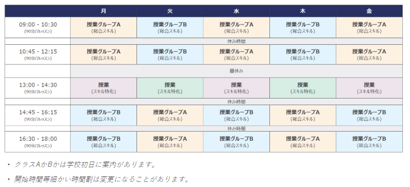 ![]() *週20レッスン:Core Classを毎日受講 *週30レッスン:Core ClassとSpecial Focus Classを毎日受講 *クラスAかBかは授業初日に案内があります。 他国からの留学生と机を並べての授業。ただし、クラス分けテスト結果によってクラスに日本人が集中したり、日本人のみのクラスとなることがあります。時期によっては日本人しかいないことがあります。 ※繁忙期は午後開始のスケジュールとなる可能性がございます。 |
