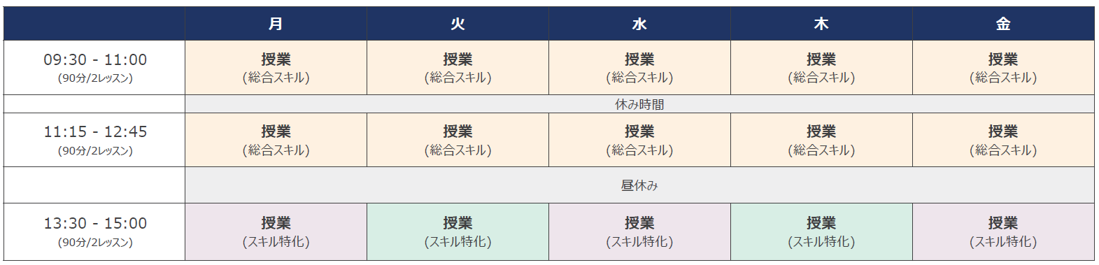 ![]() *週20レッスン:Core Classを毎日受講 *週30レッスン:Core ClassとSpecial Focus Classを毎日受講 (注意:週30レッスンの受講の場合、アメリカ学生ビザF1の申請が必要です) *アメリカ校は通年でシングルバンク時間割を実施する予定ですが、繁忙期は午前と午後を交互にご受講いただくダブルバンクスケジュールとなる可能性がございます。 他国からの留学生と机を並べての授業。ただし、クラス分けテスト結果によってクラスに日本人が集中したり、日本人のみのクラスとなることがあります。 |