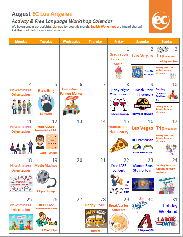学校はロサンゼルスでも人気のビーチ、サンタモニカの近くにあります。ビーチ、カフェ、ショッピングエリア、公園がすべて徒歩圏内にありとても便利な環境です。またサンタモニカのあるロサンゼルスには他にもハリウッド・ビバリーヒルズなどの観光地も多くエキサイティングな都市で留学生活を満喫しましょう!
