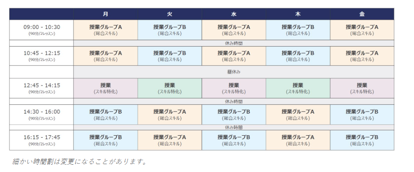 ![]() *週20レッスン:Core Classを毎日受講 *週30レッスン:Core ClassとSpecial Focus Classを毎日受講 *クラスAかBかは授業初日に案内があります。 他国からの留学生と机を並べての授業。ただし、クラス分けテスト結果によってクラスに日本人が集中したり、日本人のみのクラスとなることがあります。時期によっては日本人しかいないことがあります。 ※繁忙期は午後開始のスケジュールとなる可能性がございます。 |